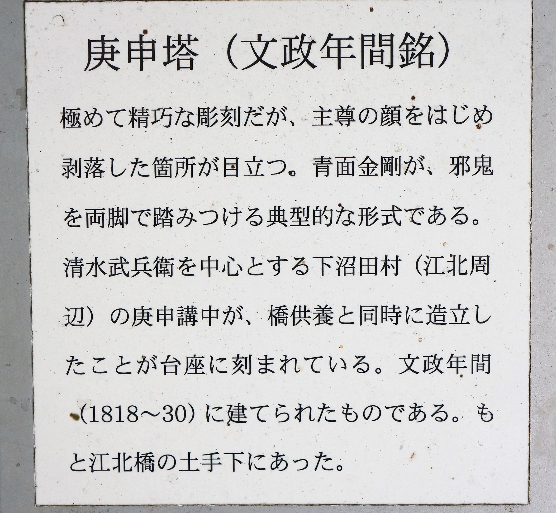 | 備考: | 駒型 青面金剛立像 当橋石垣再来 願主清水武兵衛,下沼田村庚申講中,世話□ |