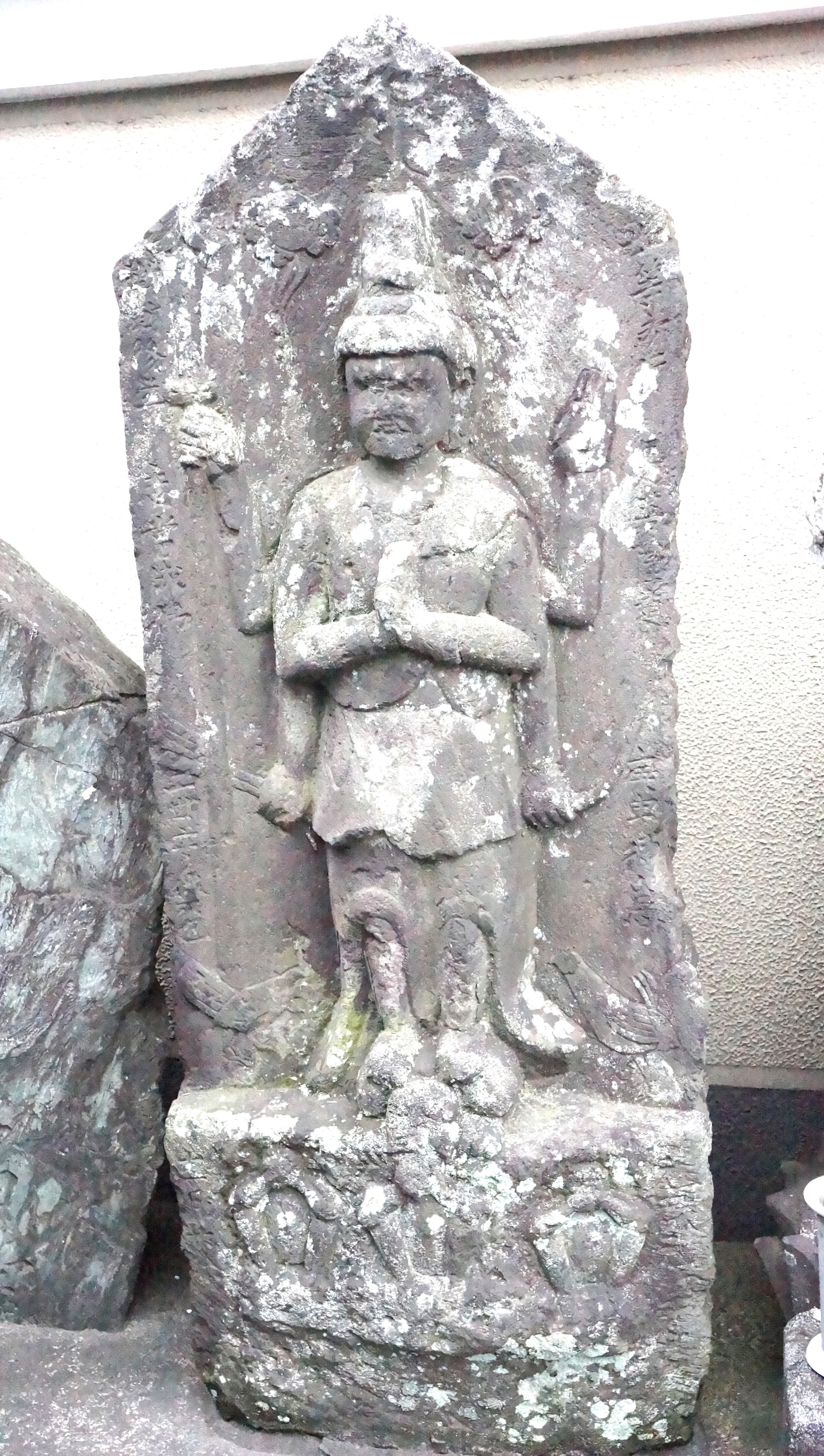 | 備考: | 光背型 青面金剛立像 合掌六臂 日月邪鬼二鶏三猿 如等所行是菩薩道庚申□為 結集十二 人 |